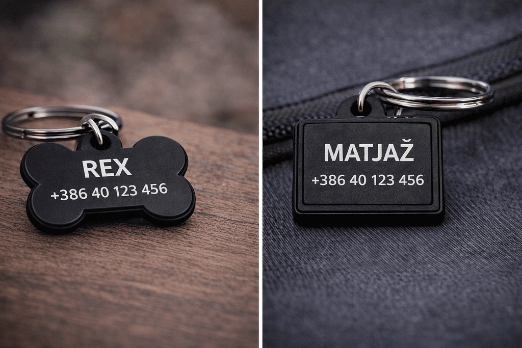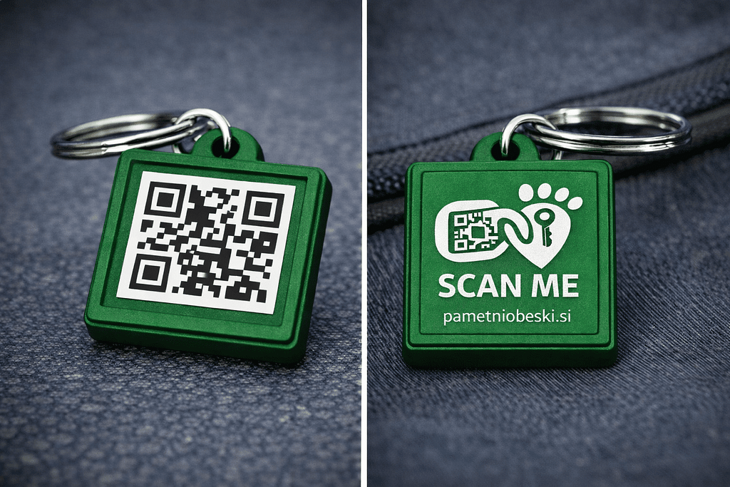 Pametni obesek z unikatno QR kodo ali vašo telefonsko številko poveže najditelja neposredno z vami – brez baterije, brez aplikacije, brez kompliciranja.